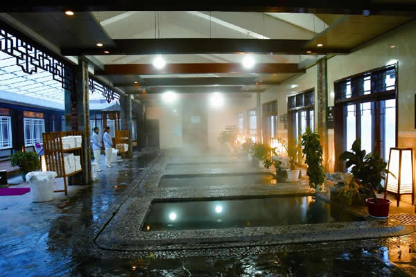 江埡溫泉主要硬件特色是高標(biāo)準(zhǔn)的自然園林式露天溫泉與室內(nèi)溫泉,建有同心池、六福湯、瀑布溫泉、石板溫泉、椰奶溫泉、花草溫泉、咖啡溫泉、紅酒溫泉等,布局體現(xiàn)出鄉(xiāng)土格調(diào),鵝卵石、青石板鋪地, 假山瀑布,小橋流水,20余種各賦特色、各具功能的溫泉池鑲嵌其中, 一派恬淡寧靜的詩情畫意。