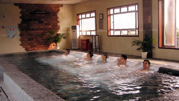 最大的主溫泉池叫“同心泉”,形似一顆紅心,寓意同心同德,萬眾一心,眾志成誠。同心泉可供200人同時共浴,水溫38-41度,可躺可坐,沐浴其中,仰望藍(lán)天白云,遠(yuǎn)眺雄山奇峰,伴隨著典雅的鄉(xiāng)村音樂,周身便覺溫曖如春、愜意萬分。