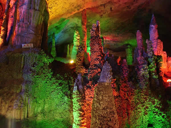 九天洞位于湖南張家界市桑植縣城17公里的利福塔鄉(xiāng),距市區(qū)70公里,距武陵源62公里,因洞內有九個自然天窗九天洞而得名,總面積250公頃,是中國目前發(fā)現的溶洞之最,比號稱世界第一的利川溶洞大三倍。九天洞內空氣清新,冬暖夏凉。整座洞穴分上、中、下三層,有五層不同高度的螺旋式觀景臺,最下層低于地表面400多米。經初步探明洞內有40個大廳、3條落差懸殊的陰河、12條瀑布、5座自生橋、10余座洞中山,此外,還有不可勝數的五光十色的鐘乳石群。在眾多迷人的景觀中尤以九星山、玉宮、水晶宮、九天玄女宮、壽星宮五大奇觀最為著名。