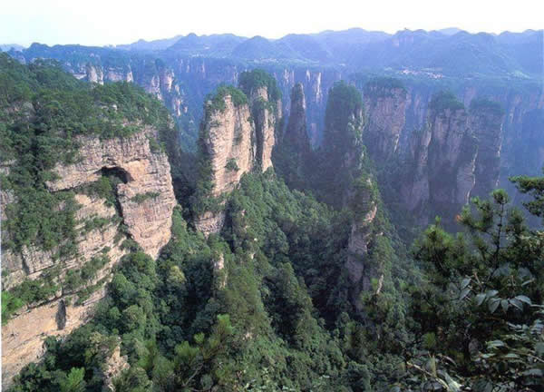 這就是大觀臺。極日遠眺,千百座奇峰盡收眼底。一位詩人說,武陵源的砂巖石峰是一步一觀景,千步千造型,一山有四季,十步不同大。專家測算出武陵源石峰有3103座。一如一位高超的雕塑大師,模擬宇宙萬物,無不形態(tài)逼真,維妙維肖,栩栩如生,呼之欲動。有的如海螺出水,有的如金龜銜日,有的如蓮花盛開,有的如天橋橫空,有的如長槍刺大,有的如寶塔聳立,有的如老人采藥,有的如玉女梳妝,有的如將軍出征,有的如戰(zhàn)馬長嘯,有的如情人幽會,有的如夫妻相擁,有的如仙女散花,有的如村姑守望……有的孤峰獨秀,有的直插云霄,有的婷婷玉立,有的威武勇猛,有的小巧玲瓏,有的大氣磅礴。進入武陵源,但見一片峰的森林,峰的世界,峰的海洋。挺拔、奇秀、集中、原始、粗獷、古野。這就是武陵源。 一位藝術大師說:武陵源的山峰,改寫了山的概念。大攝影家陳勃說 :“三山五岳堪比美,華夏風光第一流。”王繼杰先生說:“武陵源上二日游,勝讀千篇李杜詩!痹S世杰先生說:“秀幽險峻稱奇絕,五岳黃山拜·卜風!崩畛扇鹣壬鸀榇舜蟊Р黄剑骸吧裰輨倬罢l為最?須請霞公重評勘!笨上煜伎蜔o緣到大觀臺來,也不可能為武陵源作甚評價了。