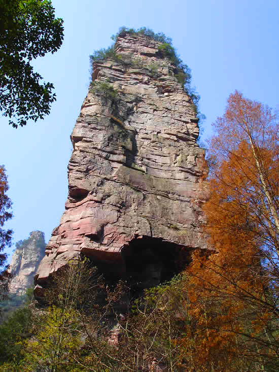 金鞭巖:過“閨門峰”沿溪而下約500米,有一座高約400米,孤標直立,雄奇挺拔的奇峰,名金鞭巖。金鞭巖是武陵源著名景點,峰體上細下粗,四棱分明。棱面布滿節(jié)理橫紋,形成鞭節(jié),渾如一根豎插大地的長鞭。每當夕陽晚照,鞭身涂金,熠熠閃光,瑰麗奪目,構成一幅奇特壯美的“夕陽金鞭圖”。