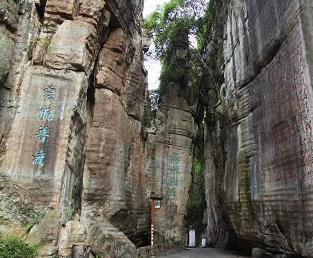 清嘉慶年間辟有洗心池!安欢T”如斧斫神劈,為石林天成,石林壁上鐫滿歷代文人的詩詠。這里古柏參天,藤蘿倒掛,環(huán)境幽美。有壁石如書的萬卷書者,有嵐霧束腰的七級青石培英塔。凝神盤坐的南海觀音是一塊天然造型的巨石,惟妙惟肖。觀音巖周圍,環(huán)繞著具有明清風格的地藏庵、嵩山堂、水府閣等建筑物,布局靈巧緊湊,主題鮮明,因勢造景。景點間曲徑迂回,迷趣深奧,稱八陣圖。景區(qū)內的河灘上有兩處溫泉,氤氳縈繞,水溫適宜(41℃),水質良好,能治療多種疾病?h城人民經“不二門”前往溫泉就浴者絡繹不絕,現(xiàn)又增建了石牌坊和民俗博物館。