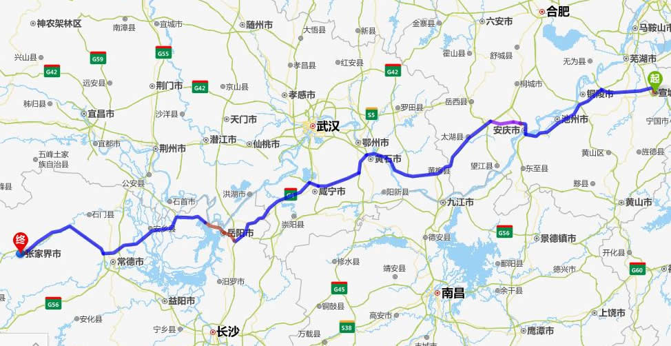 宣城去張家界自駕車自助游線路圖全程高速):