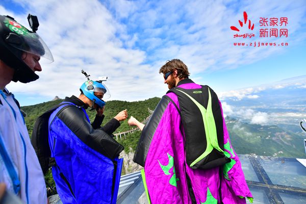2017世界翼裝飛行世錦賽將于9月8日-10日在張家界天門山舉辦。開賽在即,9月7日上午,來(lái)自全球11個(gè)國(guó)家的16名翼裝飛行員從海撥1458米的張家界天門山玉壺峰頂一躍而下,在奇峰險(xiǎn)壑間進(jìn)行競(jìng)速訓(xùn)練。